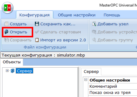 После установки запустите программу. Скачайте шаблон для мониторинга датчика и откройте его с помощью MasterOPC Universal Modbus Server.