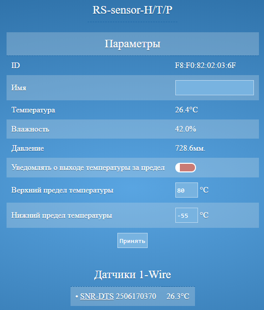 Страница настроек SNR-RSSensor-H/T/P: